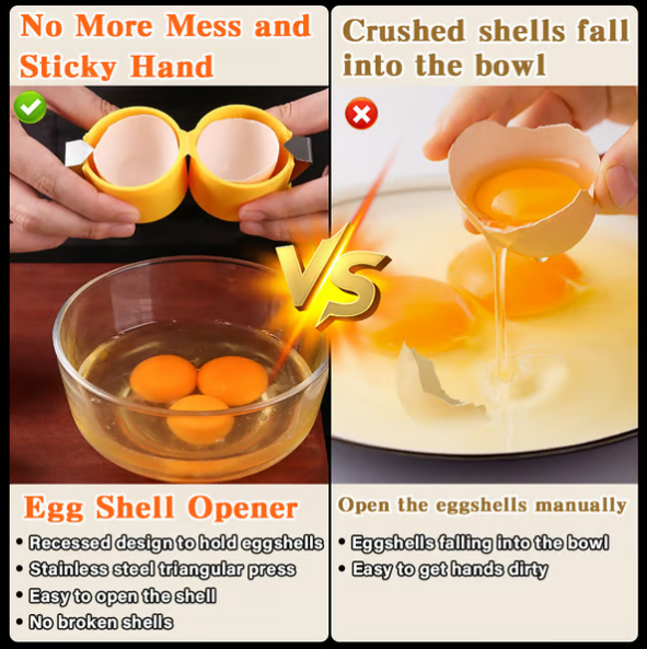 Simple & Quick Egg-cracking: It is ergonomic, featured by the cube appearance and oval groove, and the egg opener can stably contain the egg, so the egg is not easy to fall, the shell pieces will not fall when the egg is opened. And will not damage the yolk, let alone dirty hands.